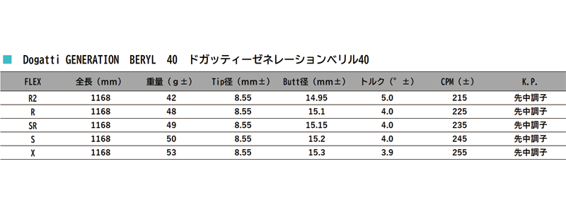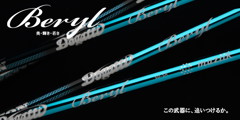 High modulus (65t) carbon sheet is used. By using titanium fiber in the entire length of the straight layer, the tensile strength is increased and the shaft has a good return to elasticity, and the shaft combines the contradictory qualities of stickiness and drive. In addition, reverse torque is suppressed at impact, making face control easier and directionality more stable. The Dogatti is also characterized by its shiny, beautiful aluminum IP-processed coloring, which is appropriate for BERYL (beauty, brilliance, and youth).