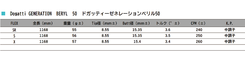 High modulus (65t) carbon sheet is used. Titanium fibers are used in the entire length of the straight layer to increase tensile strength and improve the return of flex. The Beryl 50 is a shaft with a gradual increase in stiffness from the tip to the butt side to create an overall more tenacious finish, allowing players with high head speeds to hit with confidence.