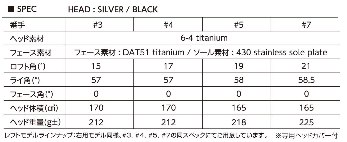 The four lofts available are #3 (spoon - 15°), #4 (baffy – 17°), #5 (cleek –19°) and #7 (21°), thus allowing golfers to create two-piece or three-piece fairway configurations to suit their games. The 3-wood and 4-wood are identical in weight, so either can form the longest fairway in the bag while paired with two or three higher lofts.